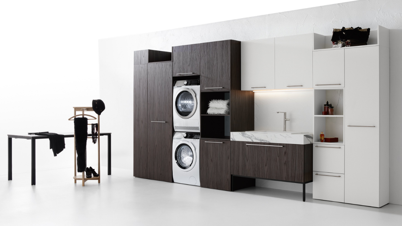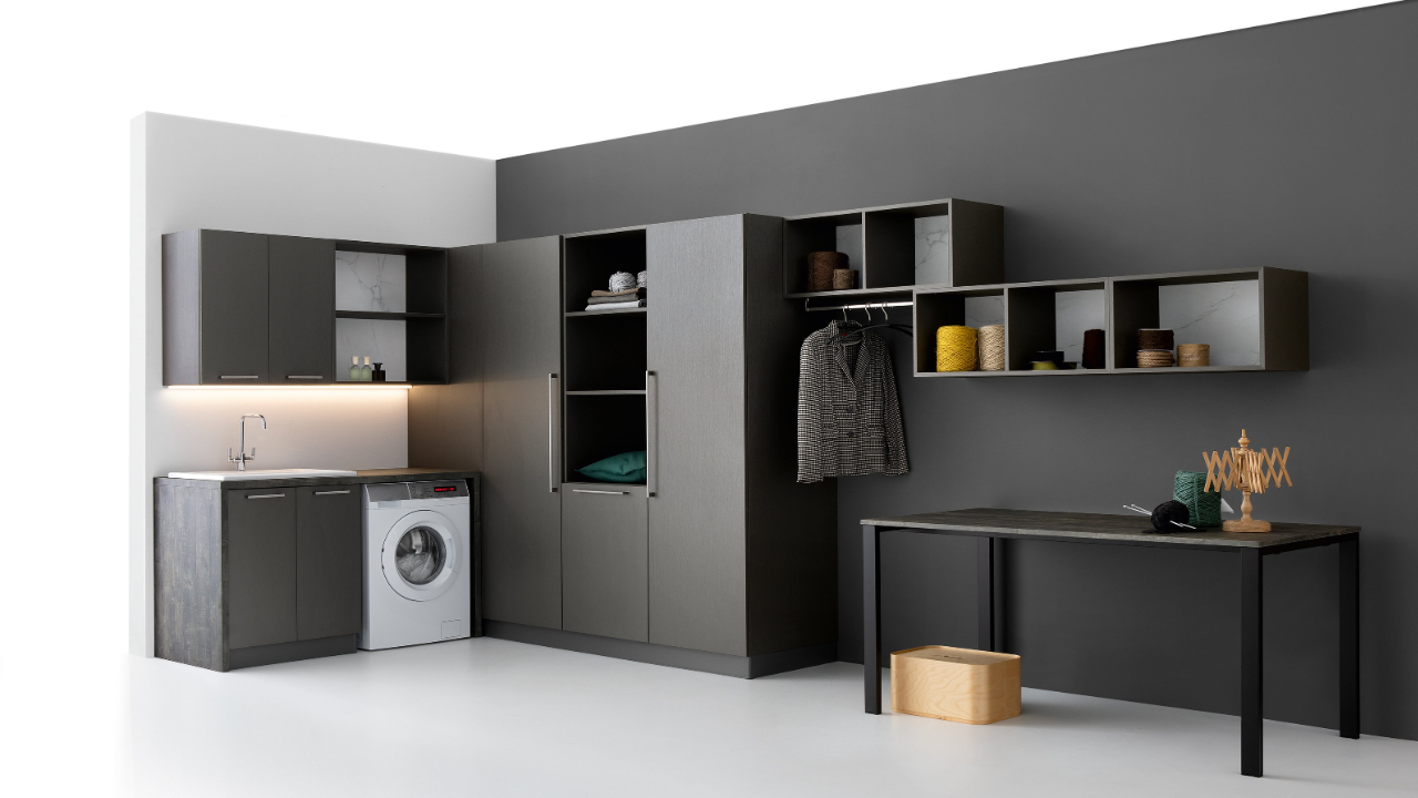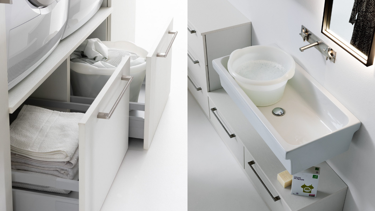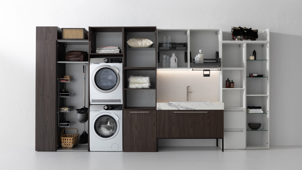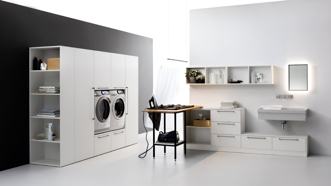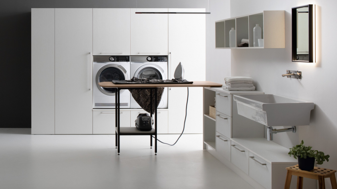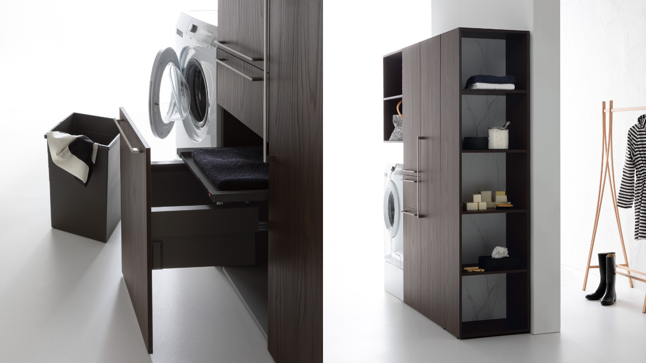 Spazi funzionali e linee essenziali trasformano la lavanderia in un ambiente ordinato e piacevole.