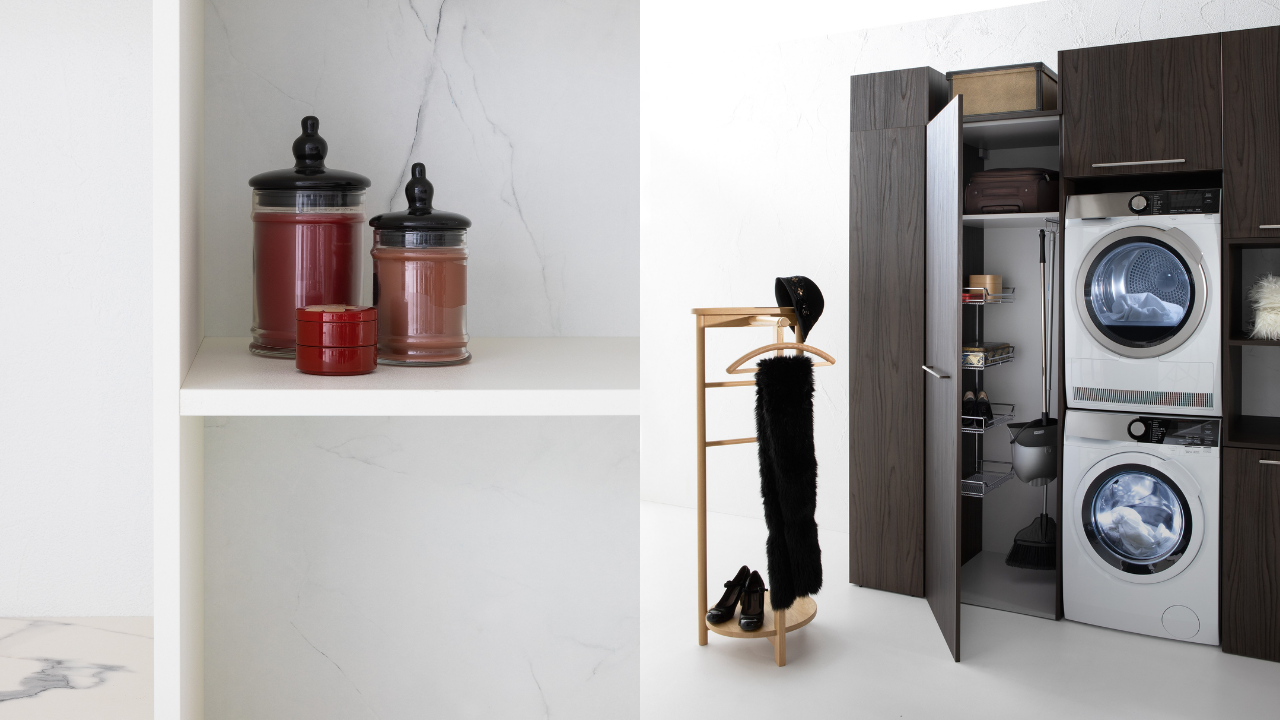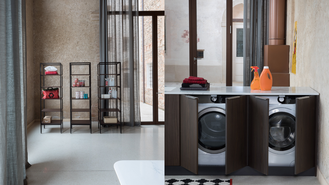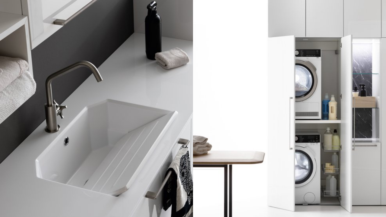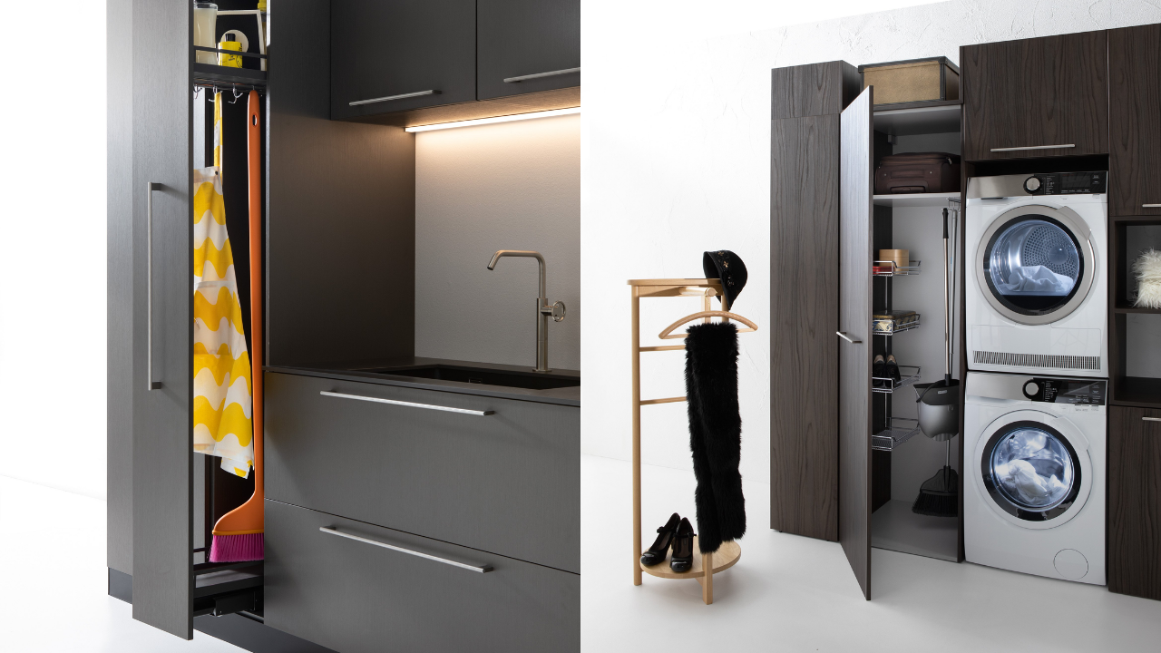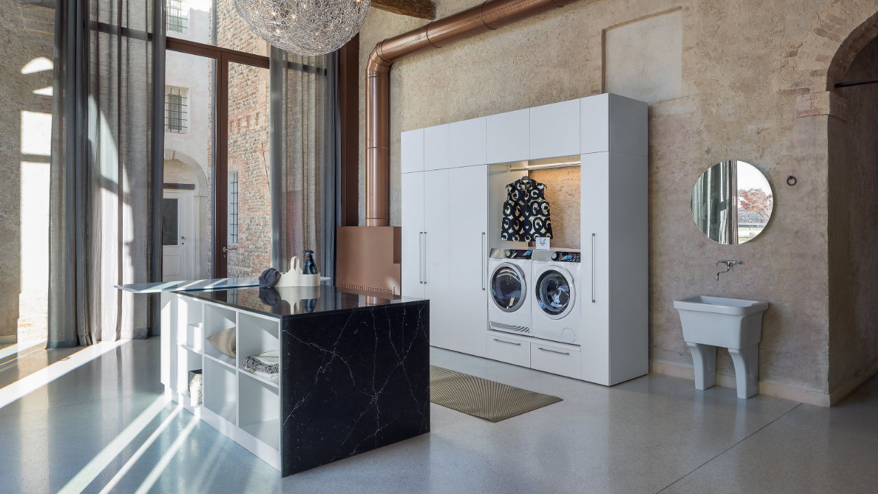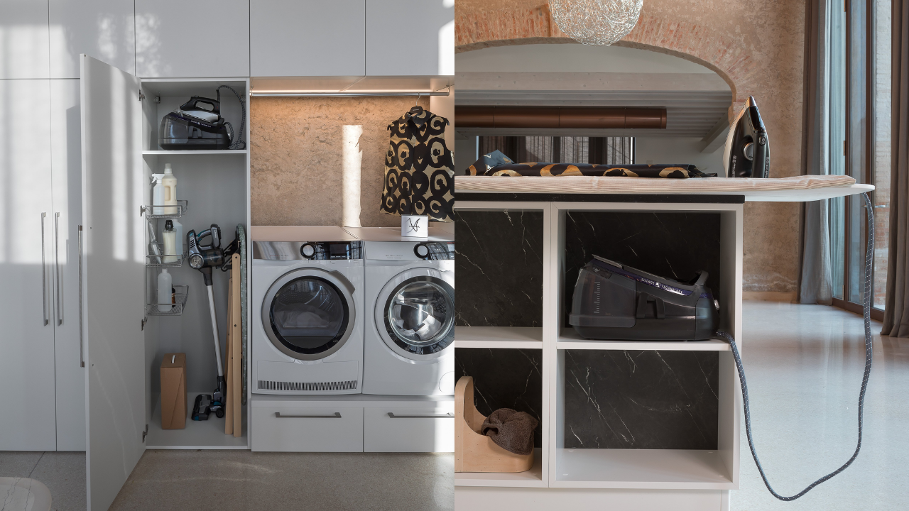 Spazi funzionali e linee essenziali trasformano la lavanderia in un ambiente ordinato e piacevole.