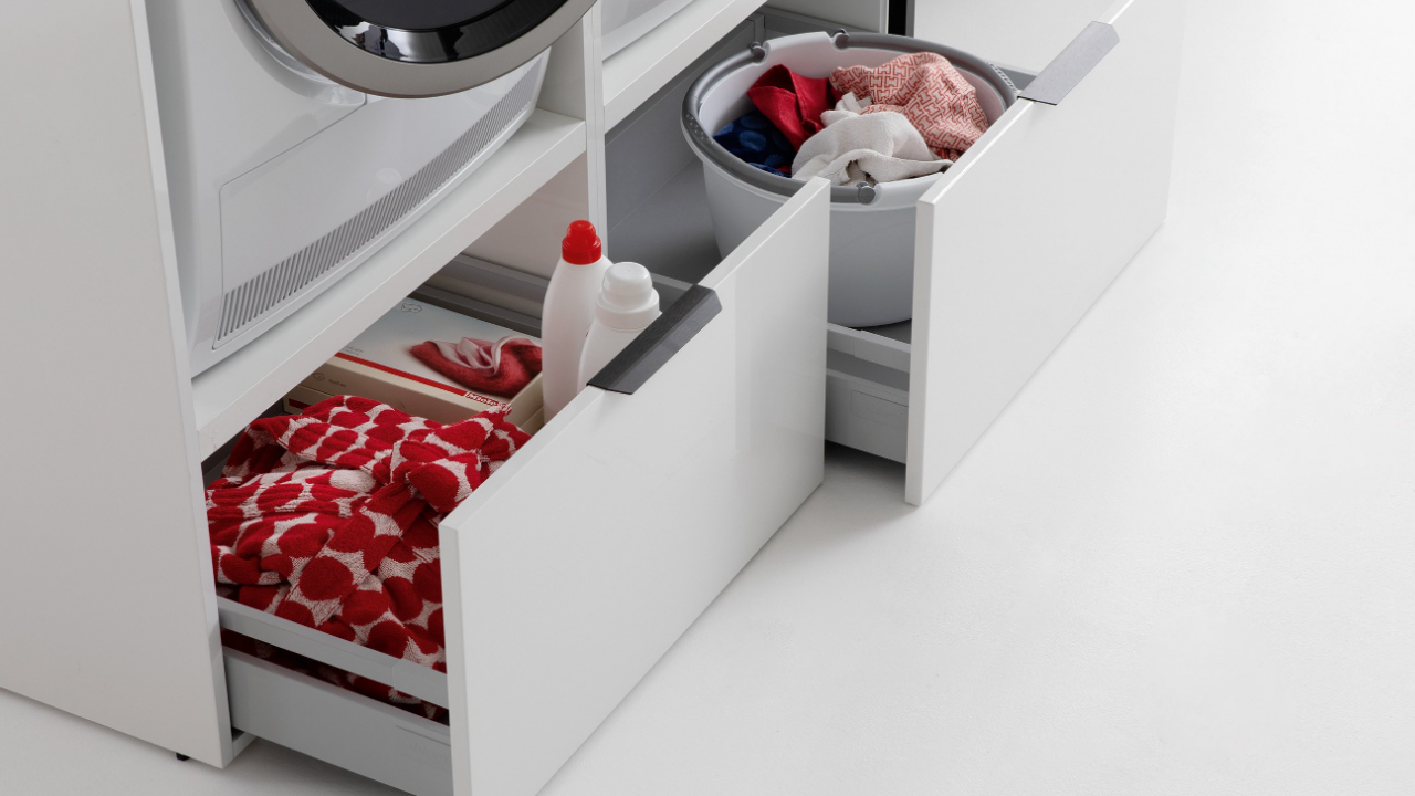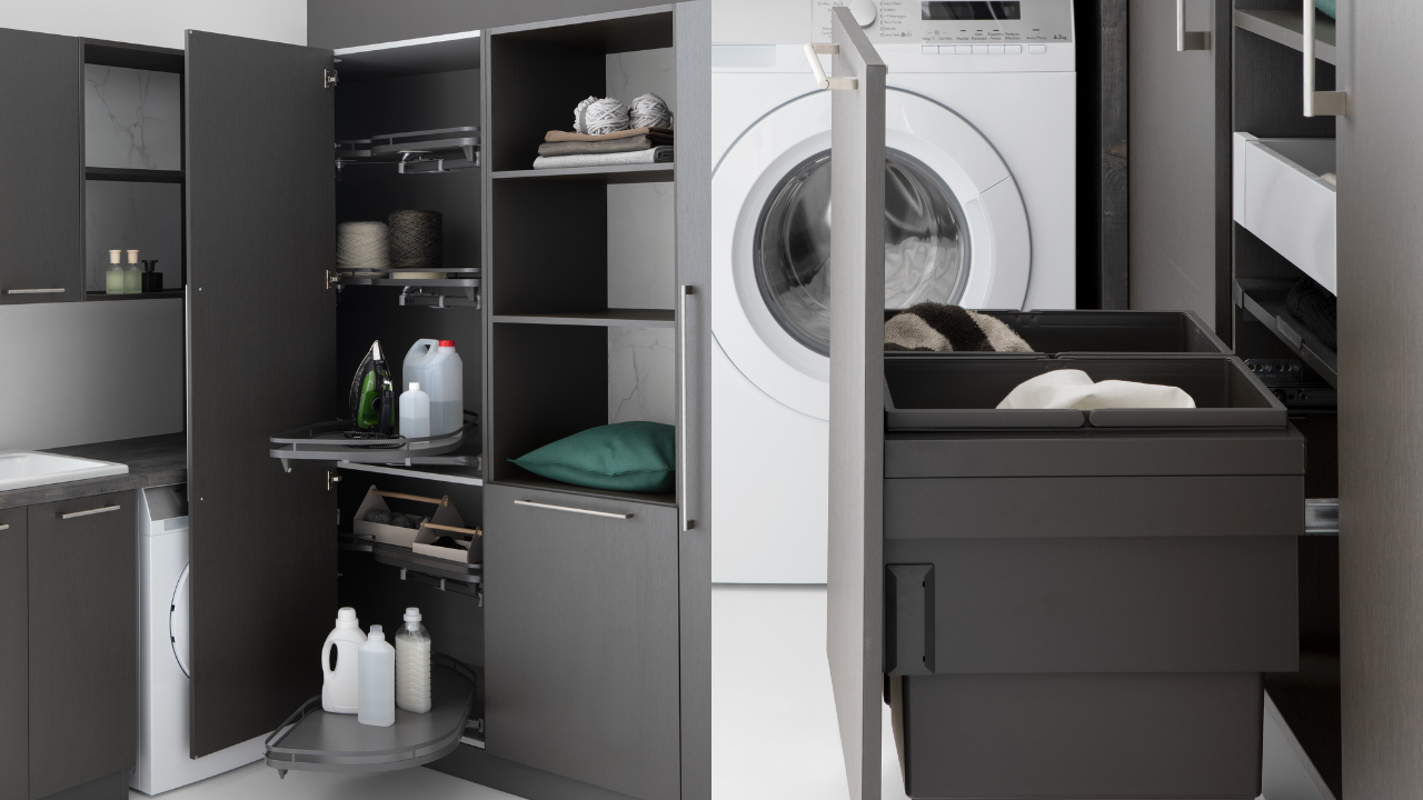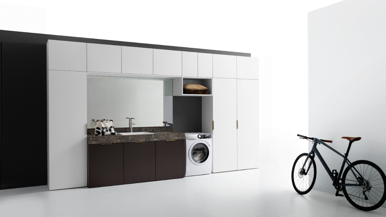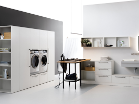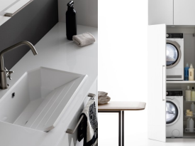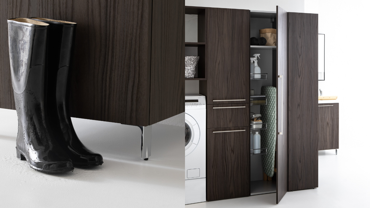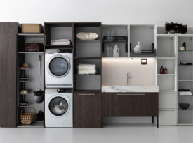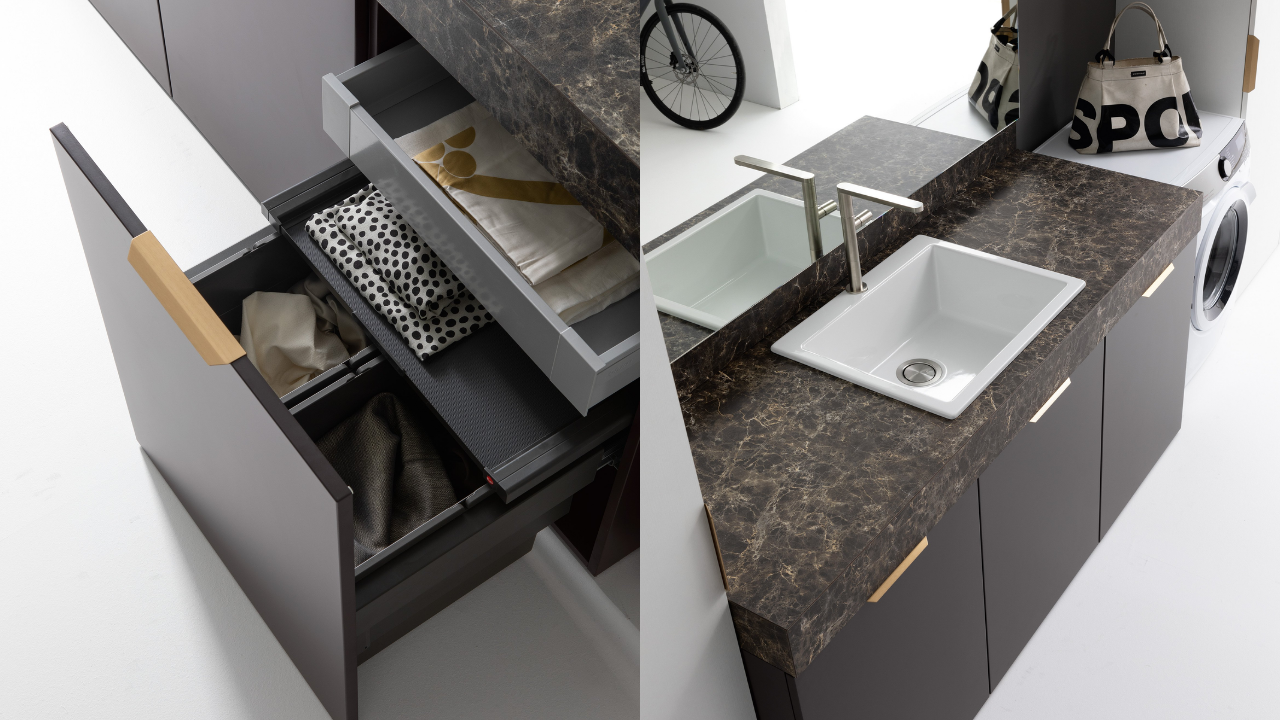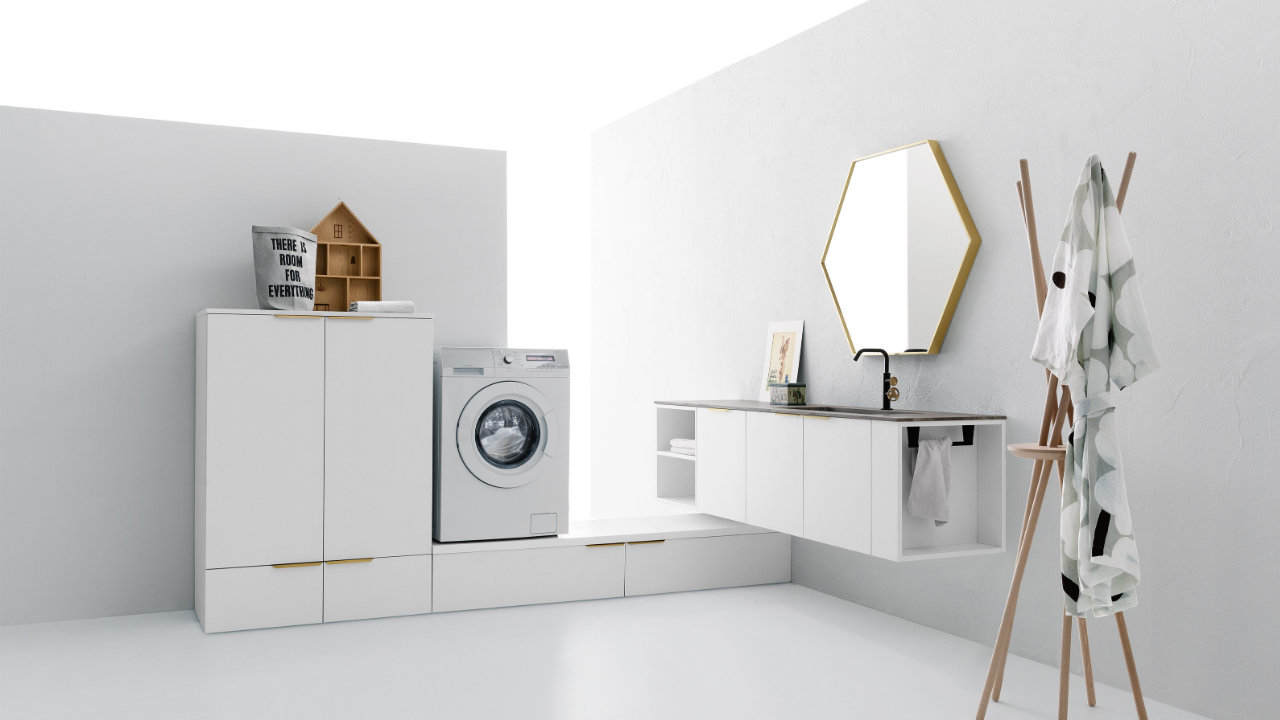 Spazi funzionali e linee essenziali trasformano la lavanderia in un ambiente ordinato e piacevole.