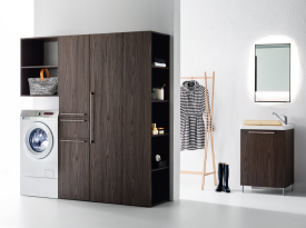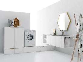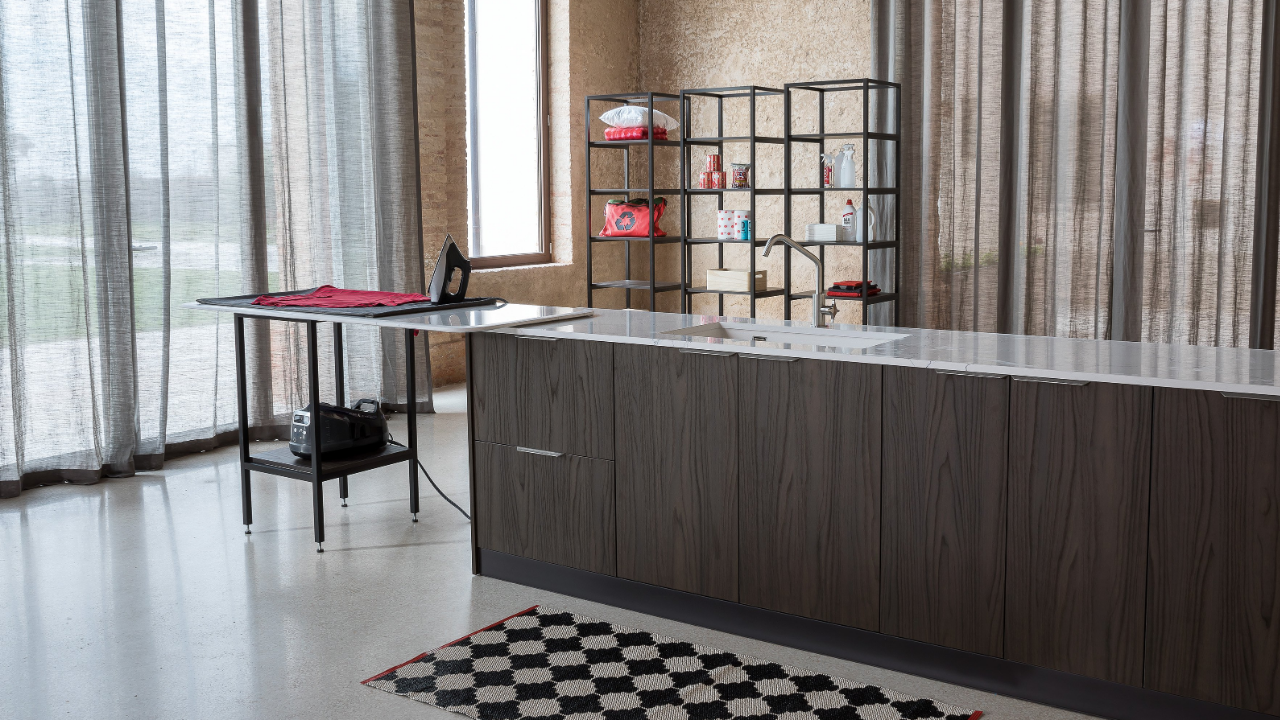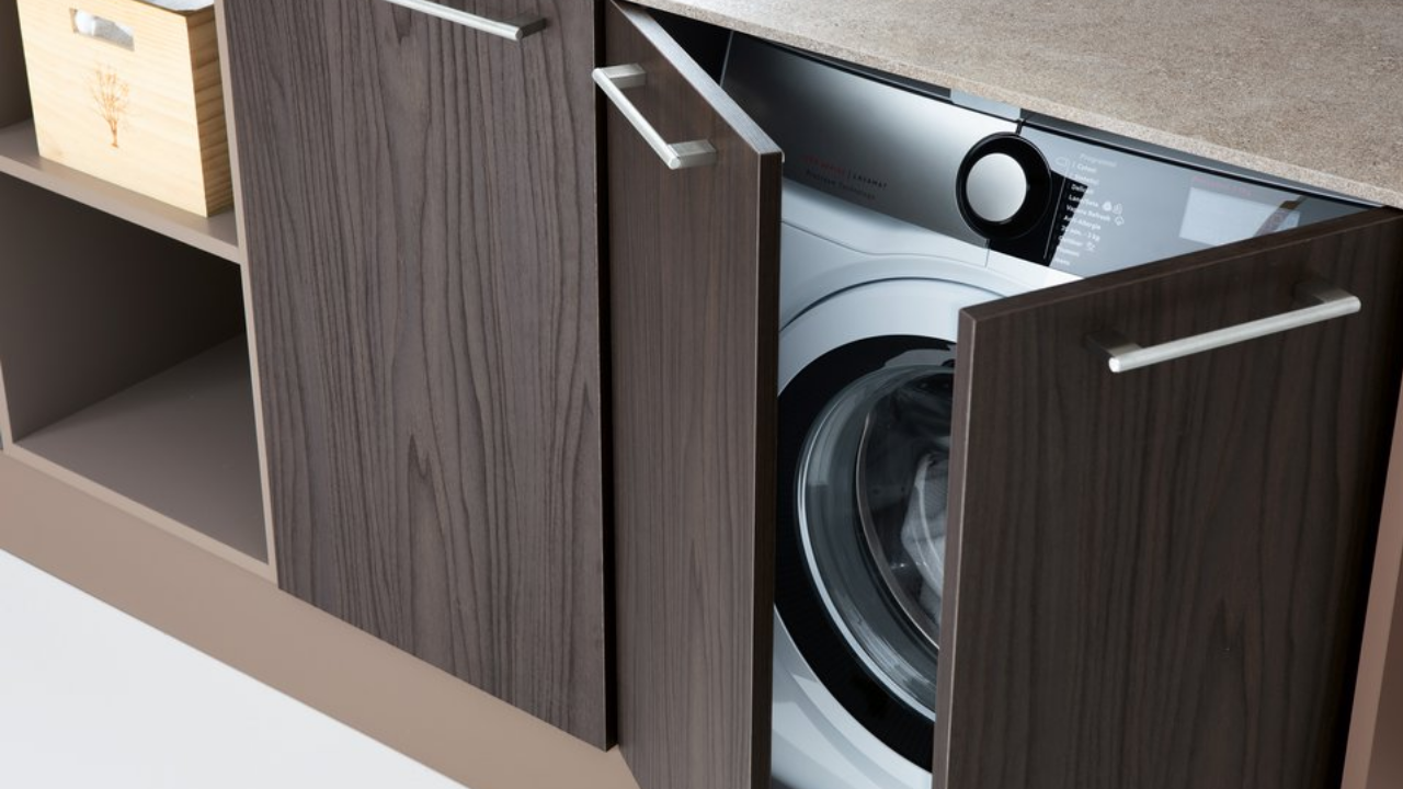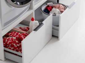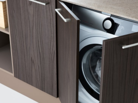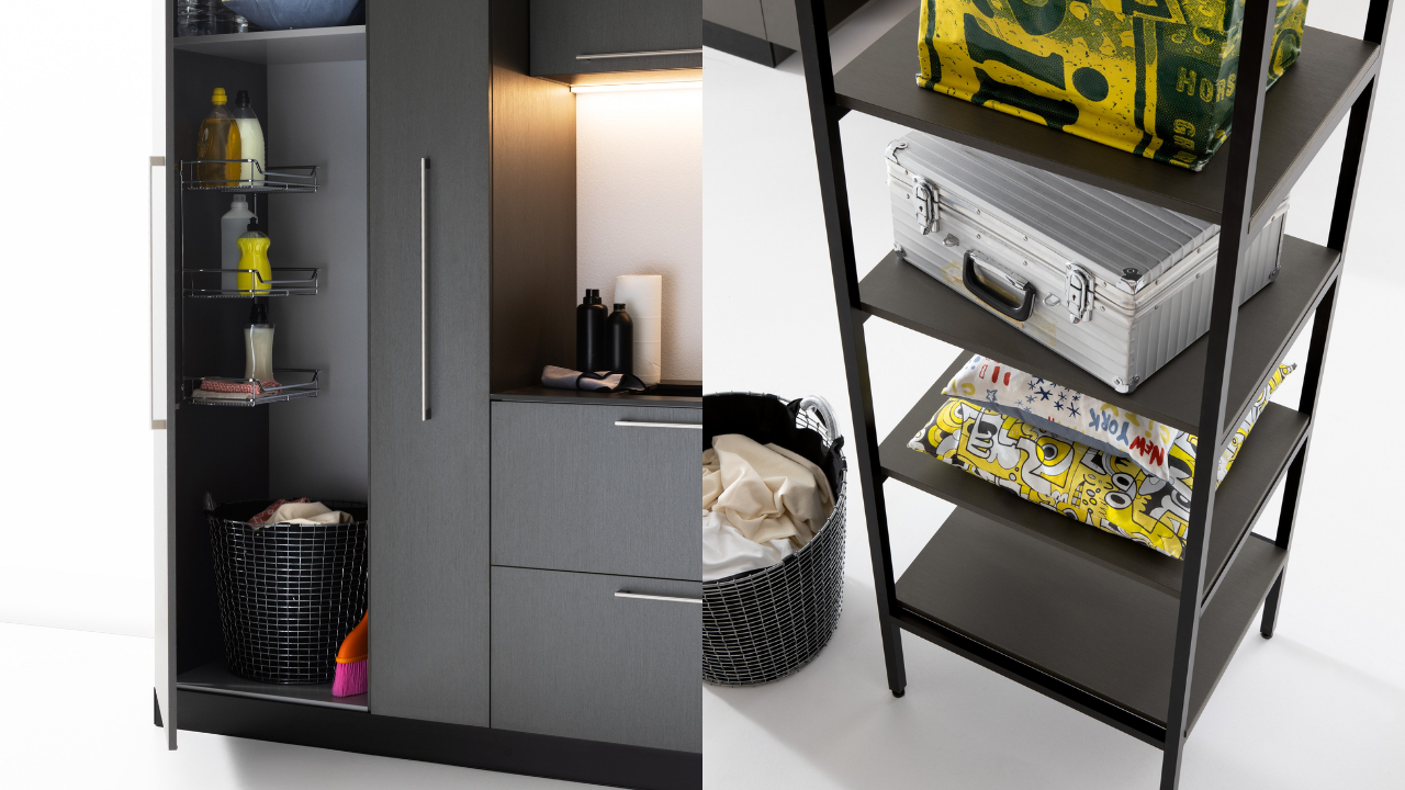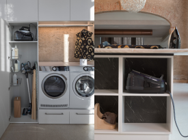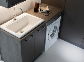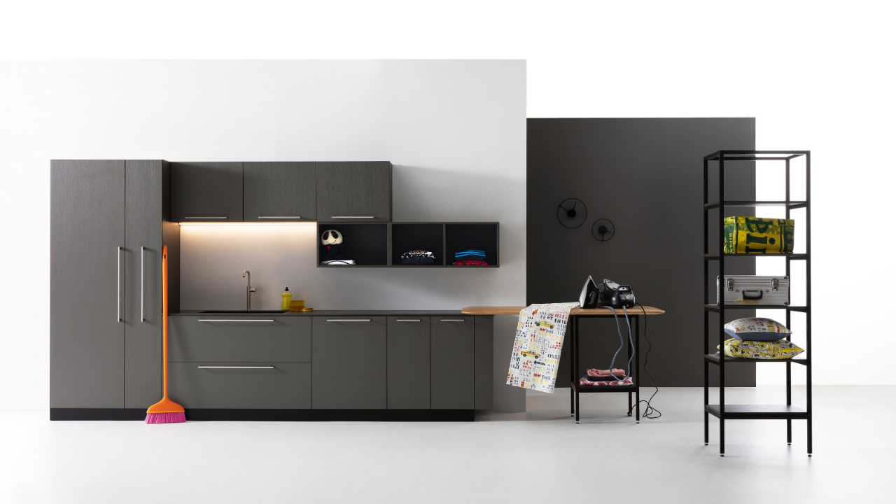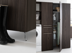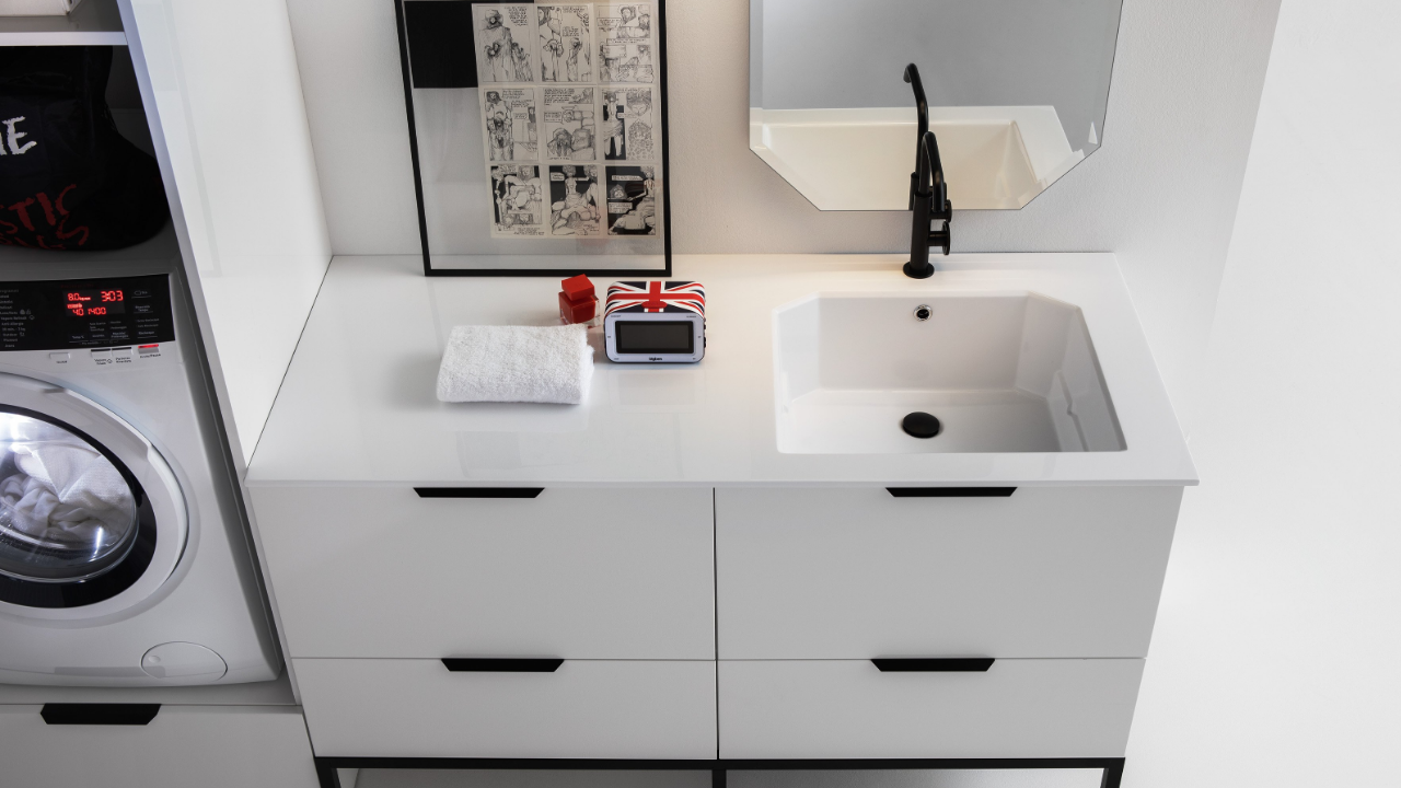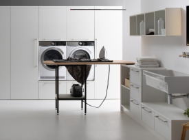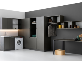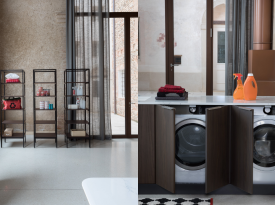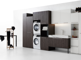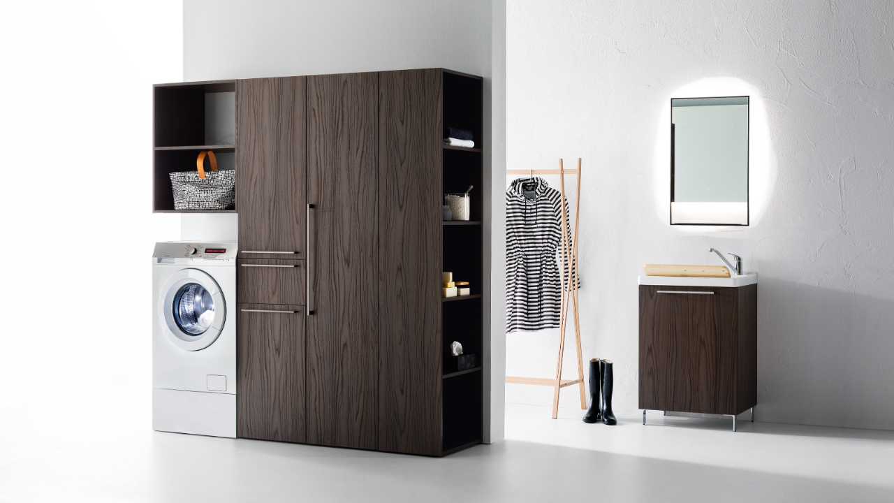 Spazi funzionali e linee essenziali trasformano la lavanderia in un ambiente ordinato e piacevole.